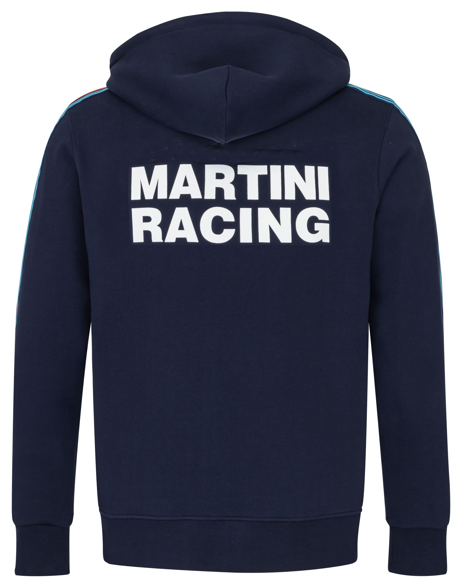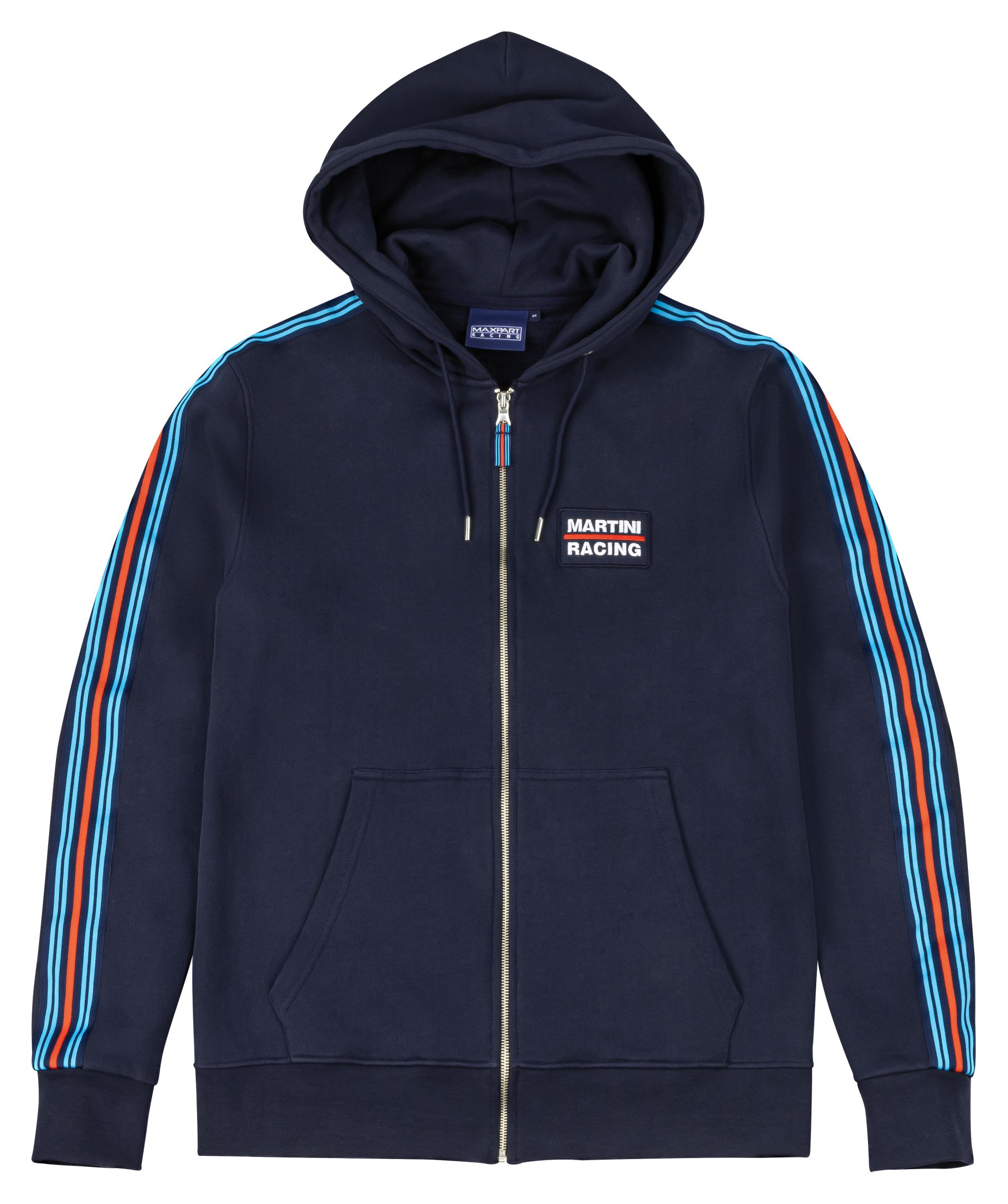 Klassisches Hoodie aus 100% Baumwolle mit durchgehendem Reißverschluss. Gewebte MARTINI RACING Streifen auf den Ärmeln, Logodruck auf dem Rücken. Gesticktes original MARTINI RACING patch auf der Brust, gewebtes Martini stripe label am Reißverschluss-Griffstück.